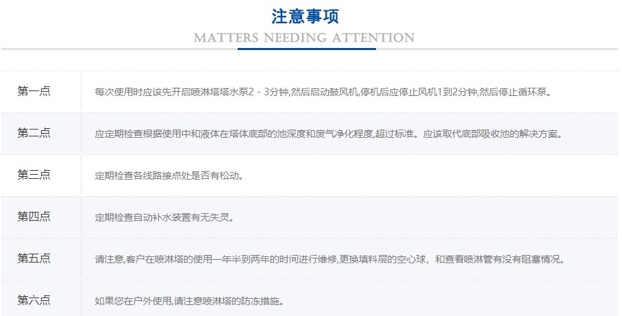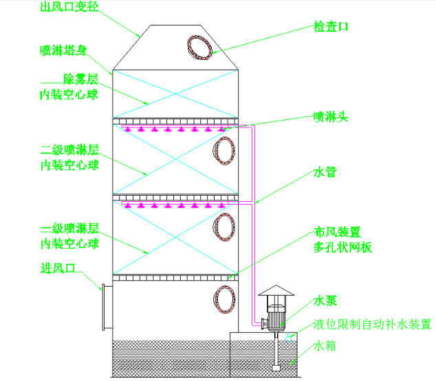 經過噴淋后的水霧再在洗滌塔內的填料層(空心球)內形成一個多孔接觸面較大的處理層,進一步的使氣體處理。水霧經過填料層后全部回到洗滌塔底部的水箱內循環利用。廢氣由下而上穿過填料層循環吸收濟由塔頂通過液體分布器,均勻地噴到填料層中,沿著填料層表面向下流動,進入循環水箱.由于上升氣體和下降吸收濟在填料中不斷接觸,上升氣流中流質的濃度愈來愈低,到塔頂達到排放要求