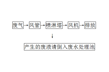 車間無機廢氣通過吸氣罩收集,在排風機作用下,經過管道輸送進入噴淋塔裝置,無機污染物被噴淋塔噴淋凈化吸收,凈化后的氣體經風機增壓后達標排放。噴淋塔處理后的廢液,請倒入廢水處理池。