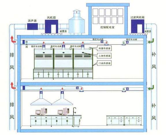 合理確定實驗室送、排風系統最大風量:實驗室排風系統排風機宜采取調頻控制,保持排風系統干管最遠點靜壓恒定。使排風機風量與系統排風量相一致。減少排風機耗電量,維持排風系統風管壓力恒定,提高排風管風量控制閥精度。同時,實驗室送風系統空調機組送風機也宜采取調頻控制,送風量應與實驗室排風系統排風量相一致。